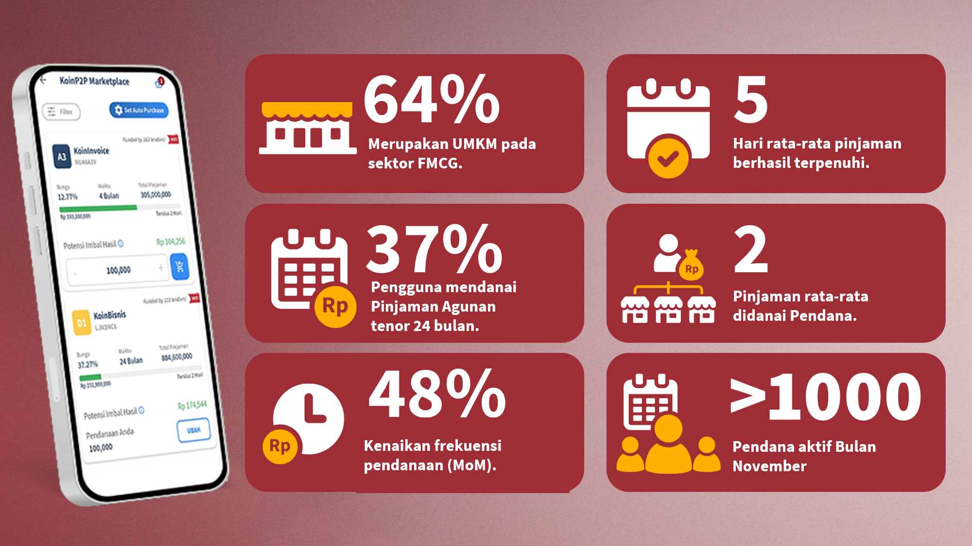 Sebanyak 64% pinjaman pada November berasal dari UMKM sektor FMCG, menunjukkan tingginya permintaan pendanaan dari bisnis yang bergerak cepat dan stabil. Dari sisi kecepatan, pinjaman di Marketplace rata-rata terpenuhi dalam 5 hari. Sebanyak 37% pendana memilih pinjaman beragunan tenor 24 bulan, memanfaatkan opsi tenor panjang untuk memperkuat cashflow dan mendapatkan imbal hasil yang lebih stabil.
