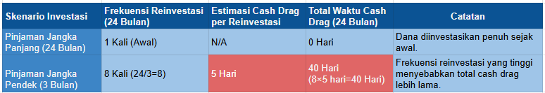 Cash Drag adalah periode di mana dana yang sudah cair kembali ke akun investor berada dalam kondisi menganggur (idle), menunggu untuk dialokasikan kembali ke pinjaman baru. Selama periode Cash Drag ini, uang Anda tidak menghasilkan imbal hasil sama sekali.