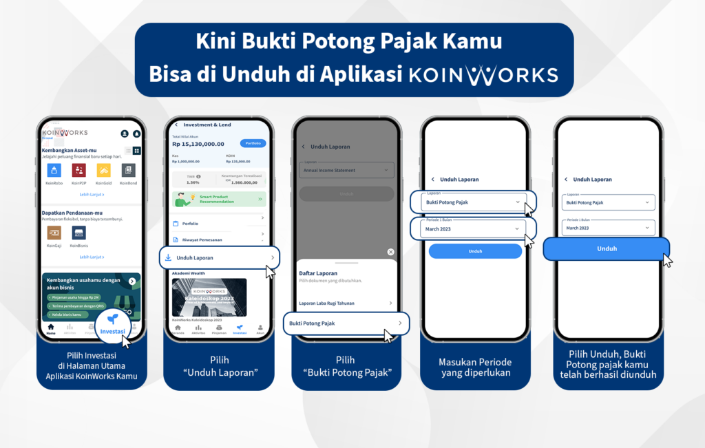 Demi meningkatkan kemudahan dan kenyamanan dalam proses pelaporan pajak para pengguna setia KoinWorks, proses pengiriman Bukti Potong Pajak yang sebelumnya melalui email, kini bisa diakses langsung melalui Aplikasi KoinWorks.